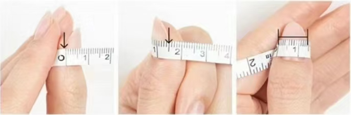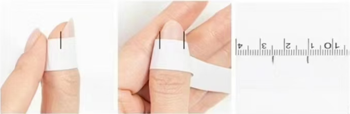 HOLD A MEASURING TAPE HORIZONTALLY TO MEASURE THE WIDEST CURVATURE OF YOUR NAIL BED. RECORD THE SIZES.