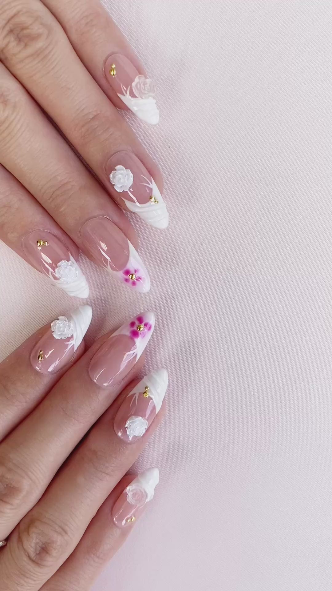The Blooming Petals nail design features soft pink and classic white hues, accented with hand-carved flowers and sparkling gold beads, perfectly embodying a blend of romance and elegance. This nail set is an ideal choice for weddings or romantic dates, ensuring that every wearer shines with timeless charm on special occasions.