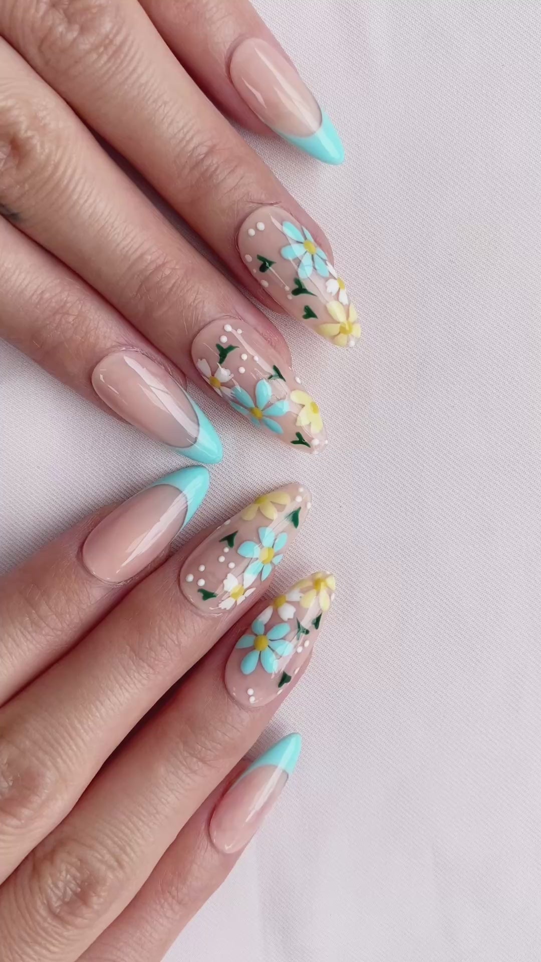 The Blue Garden nail design features soft blue French tips paired with bright daisy patterns, creating a fresh and natural vibe perfect for the spring and summer seasons. This nail art is ideal not only for everyday wear but also for adding a touch of romantic charm and natural beauty to special occasions.