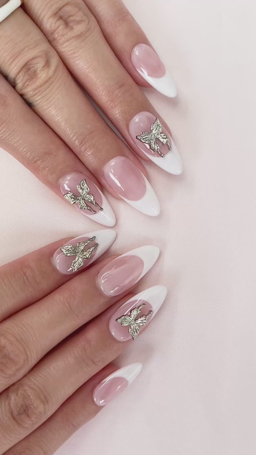 The Butterfly Elegance nail design features classic white French tips accented with delicate silver butterflies, exuding an elegant and romantic charm. This nail art is perfect for sophisticated occasions, such as weddings or special anniversaries, adding a unique touch of allure to your fingertips.