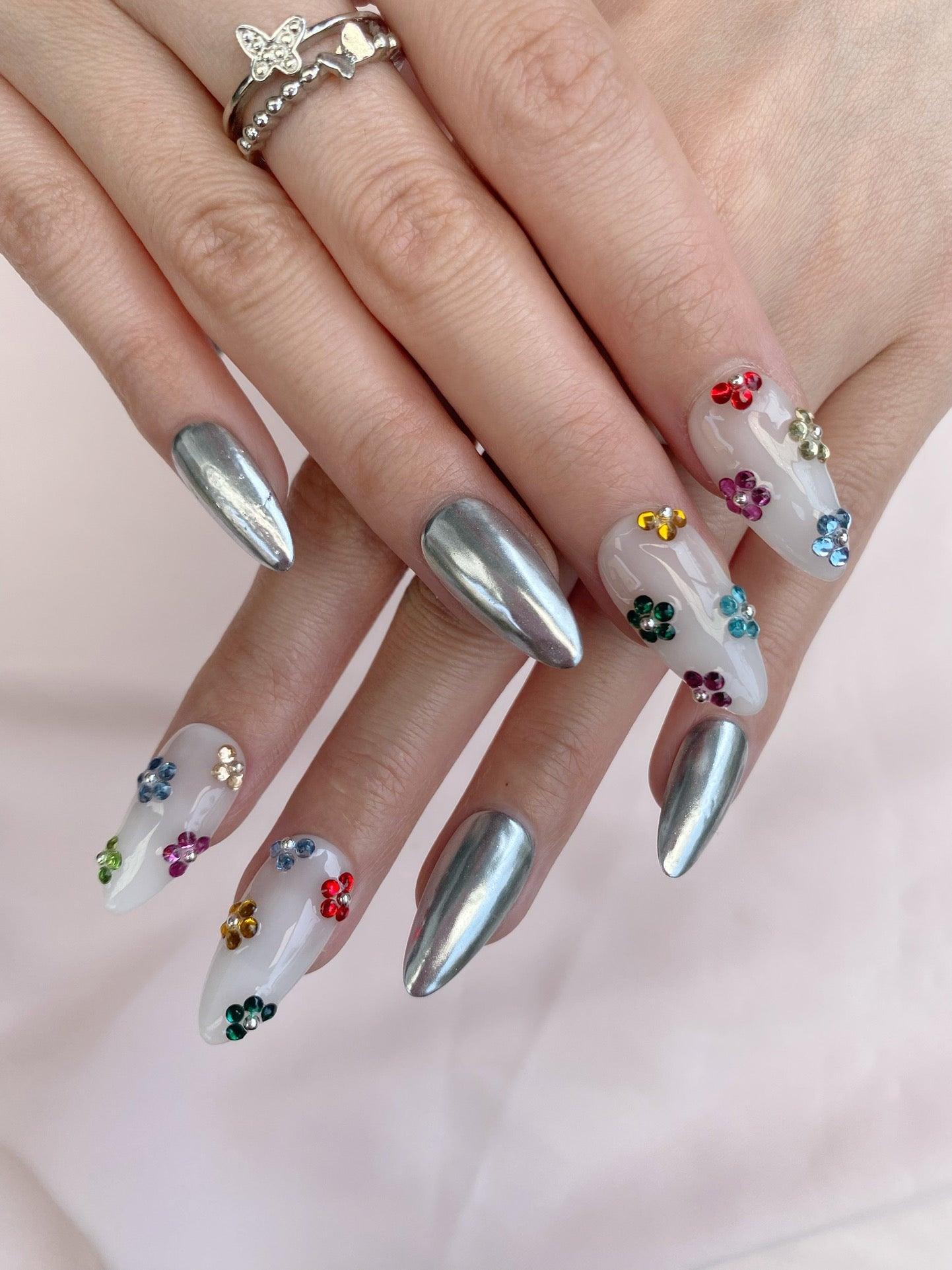 The Crystal Bloom nail design combines dazzling silver mirror effects with vibrant floral rhinestones, offering a unique touch of luxury. Whether for a party or everyday wear, this nail art will make you shine in any setting, highlighting your fashionable taste.