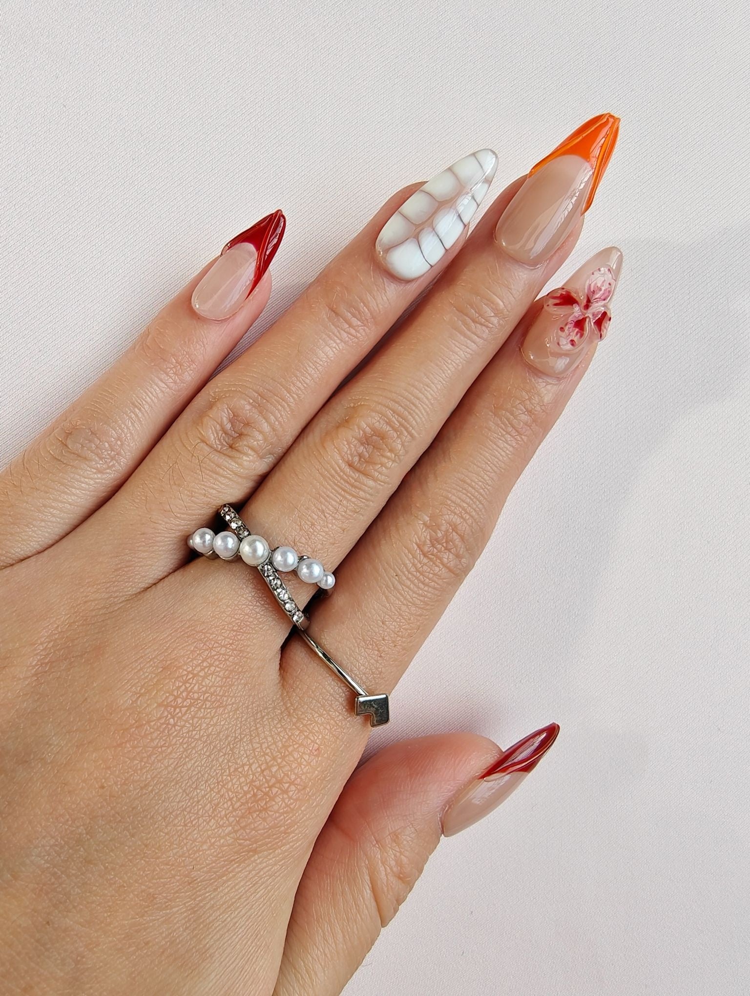 Inspired by blooming passion flowers, this nail design combines shades of white, orange, and red, offering a fresh and unique visual experience. The stiletto shape and intricate 3D floral details add a touch of elegance and a dreamy vibe to your fingertips. Suitable for any season, this nail art highlights femininity, ensuring you stand out in any setting.