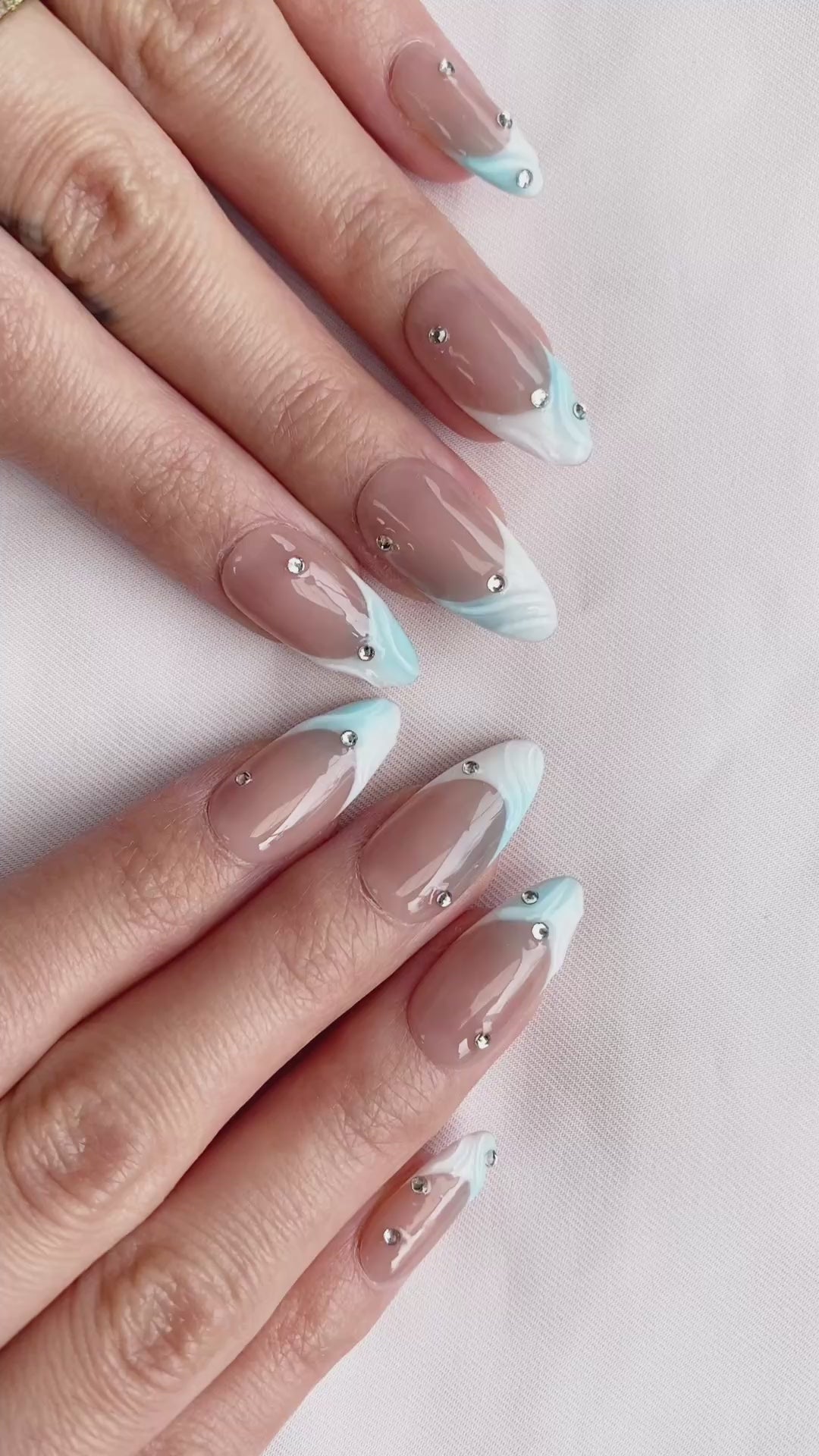 The Frosted Dream nail design features a soft icy blue gradient paired with a nude base and delicate rhinestones, creating a dreamy and elegant look. Perfect for everyday wear, this nail art also adds a touch of sparkle and romance for special occasions.