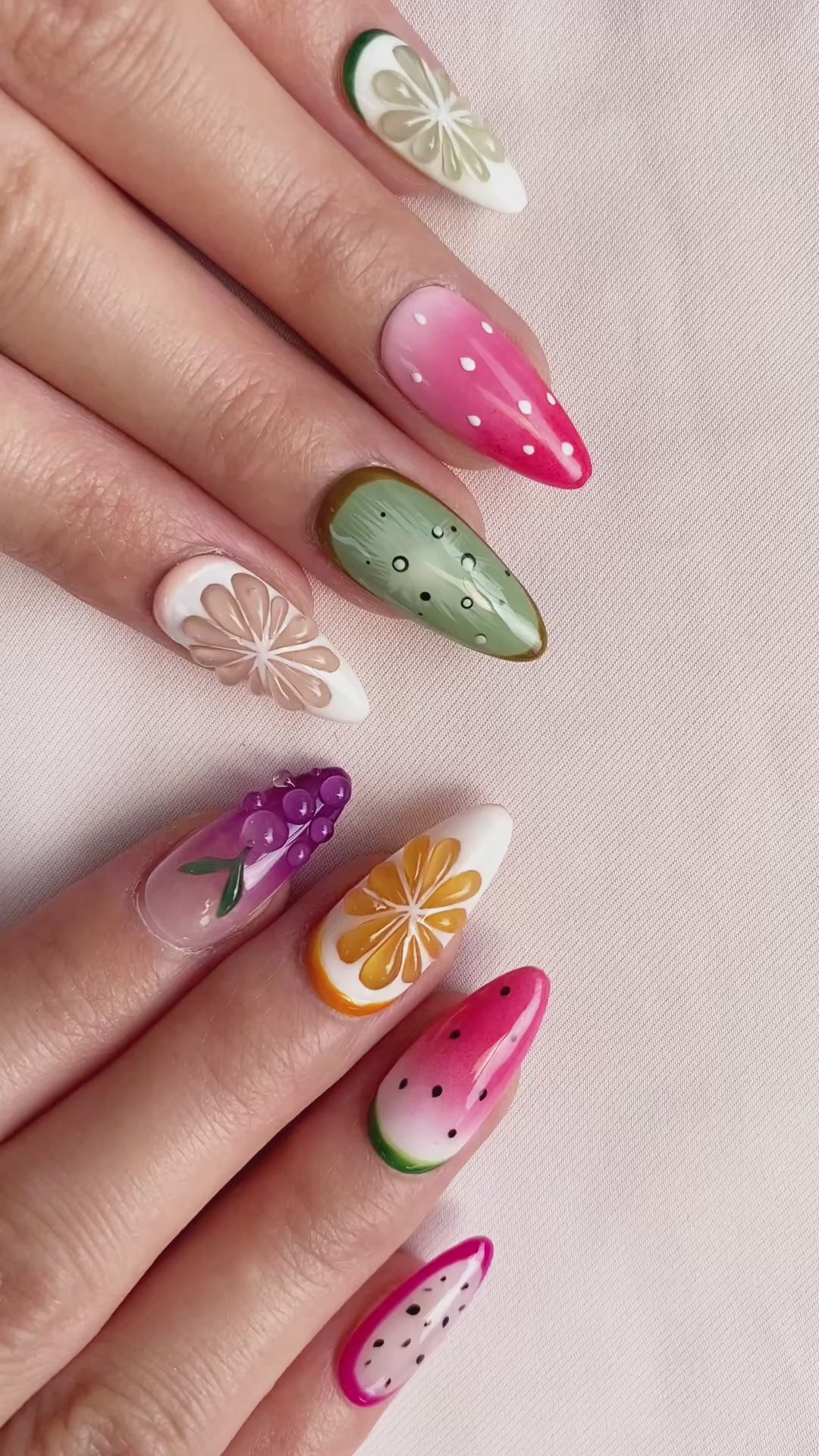 The Fruit Fiesta nail design features a vibrant mix of colorful fruits like dragon fruit, watermelon, orange, and grapes, creating a fresh and energetic style. This nail set adds a cute touch to your fingertips, making it the perfect accessory for summer parties.