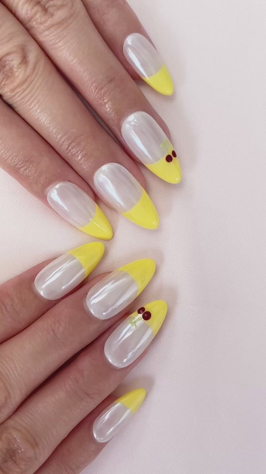 The Lemon Glow nail design features a refreshing lemon yellow paired with shimmering silver, adding a touch of natural cuteness. The cherry accents bring an extra burst of energy to the design, making it perfect for spring and summer, with your fingertips shining like sunshine.
