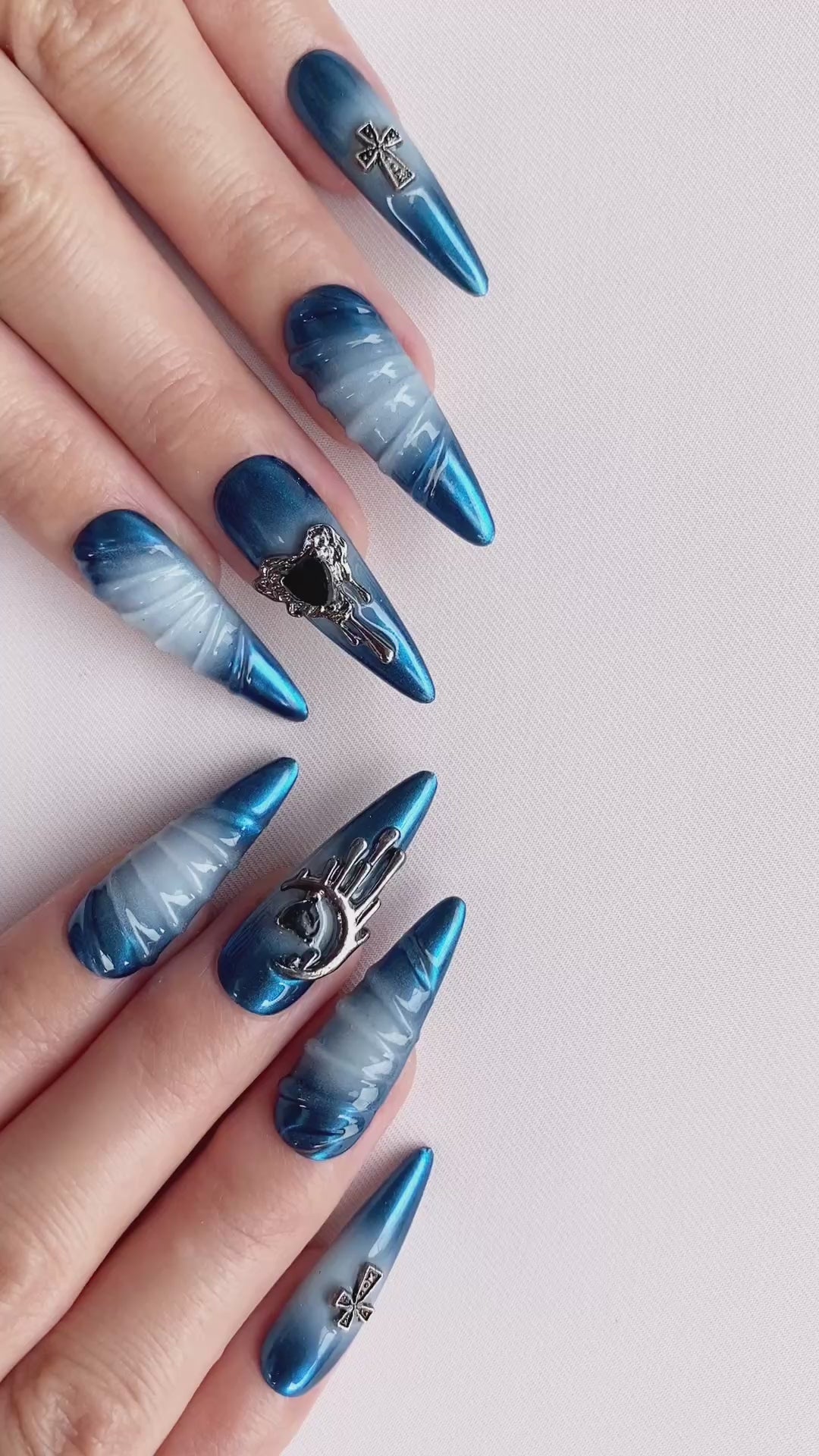The Midnight Dance nail design features a deep blue and silver gradient base, accented with intricate silver embellishments and dark-themed elements, exuding a unique and luxurious vibe. Perfect for special nighttime events, this nail art adds a touch of mystery and allure, making your fingertips the center of attention.