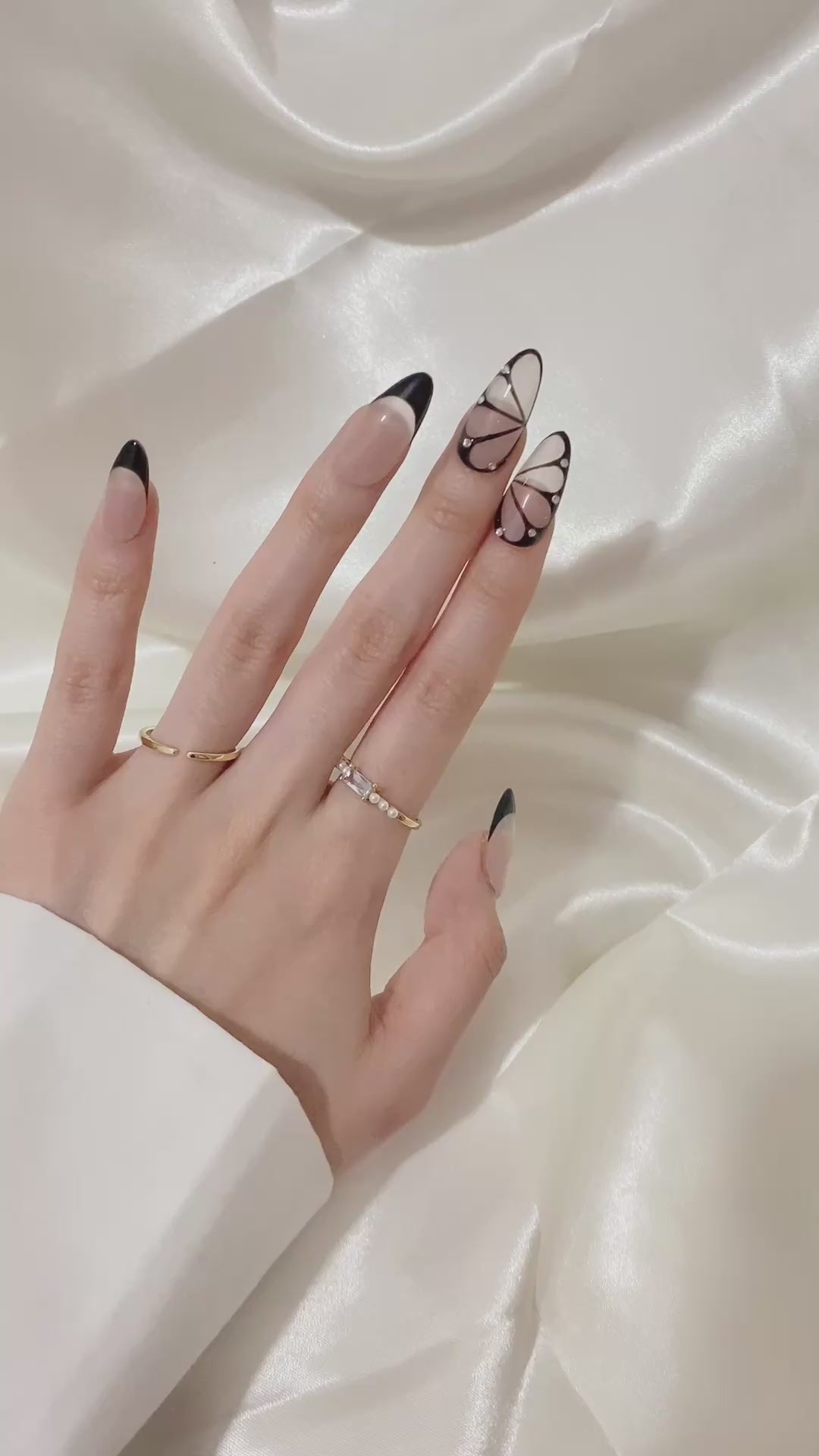 The Mono Wings nail design combines black and white tones with butterfly wing elements, adorned with delicate rhinestones, creating a minimalistic yet elegant style. This nail art is perfect for women who want to showcase sophistication through simplicity, with every detail exuding unique charm.