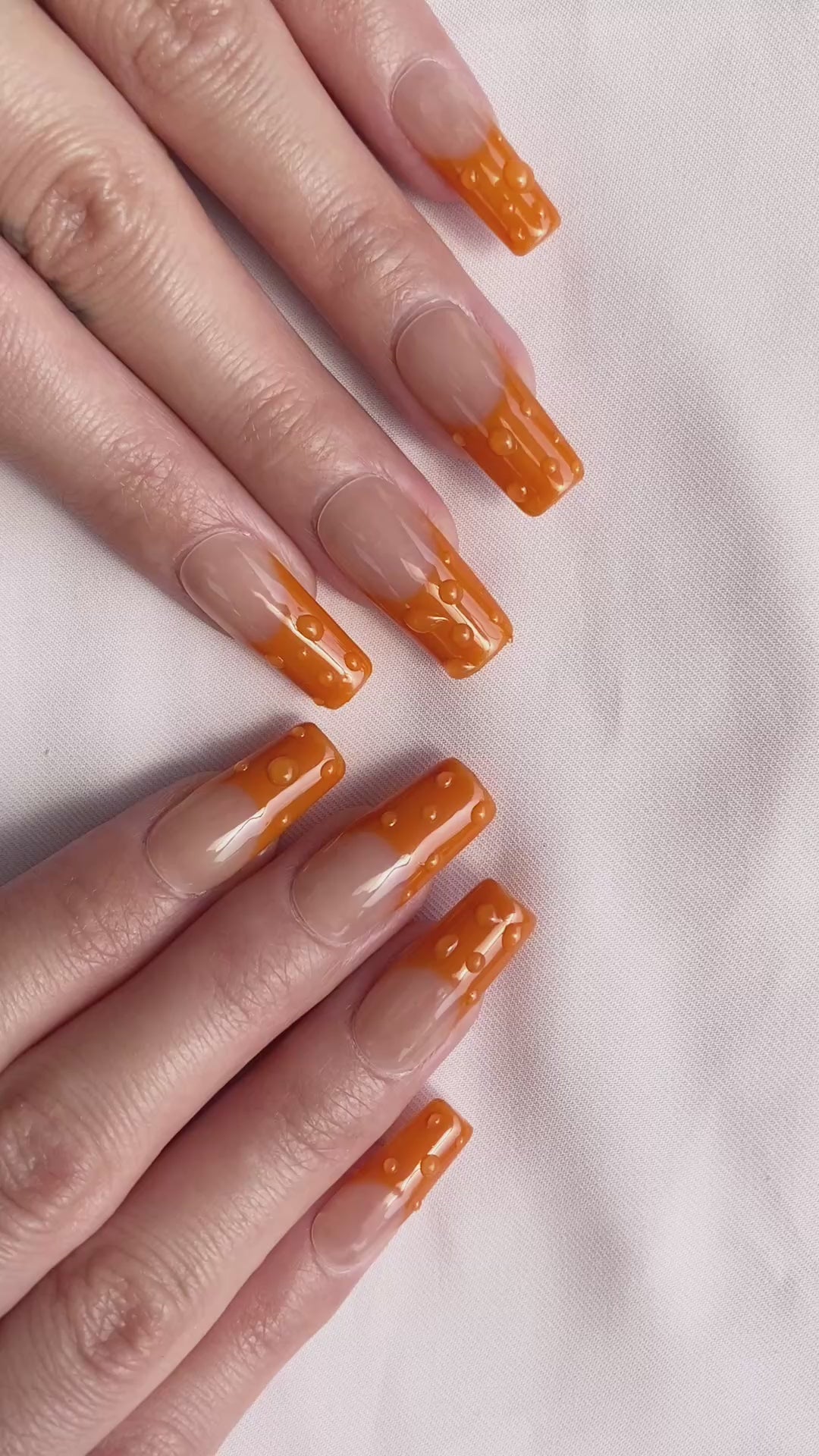 The Orange Rhythm nail design features vibrant orange French tips with 3D droplet accents, embodying a playful and modern style. Perfect for women who want to express their unique personality and fashion sense, this nail art brings energy and confidence to your fingertips.