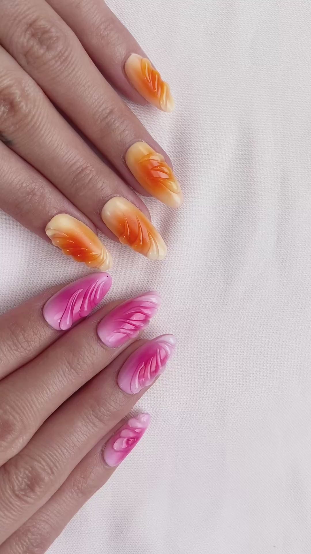 The Petal Dance nail design features soft pink and orange gradients with sculpted textures that add a unique artistic touch to your fingertips. This design showcases natural elegance while exuding a romantic vibe, perfect for those who seek something distinctive.