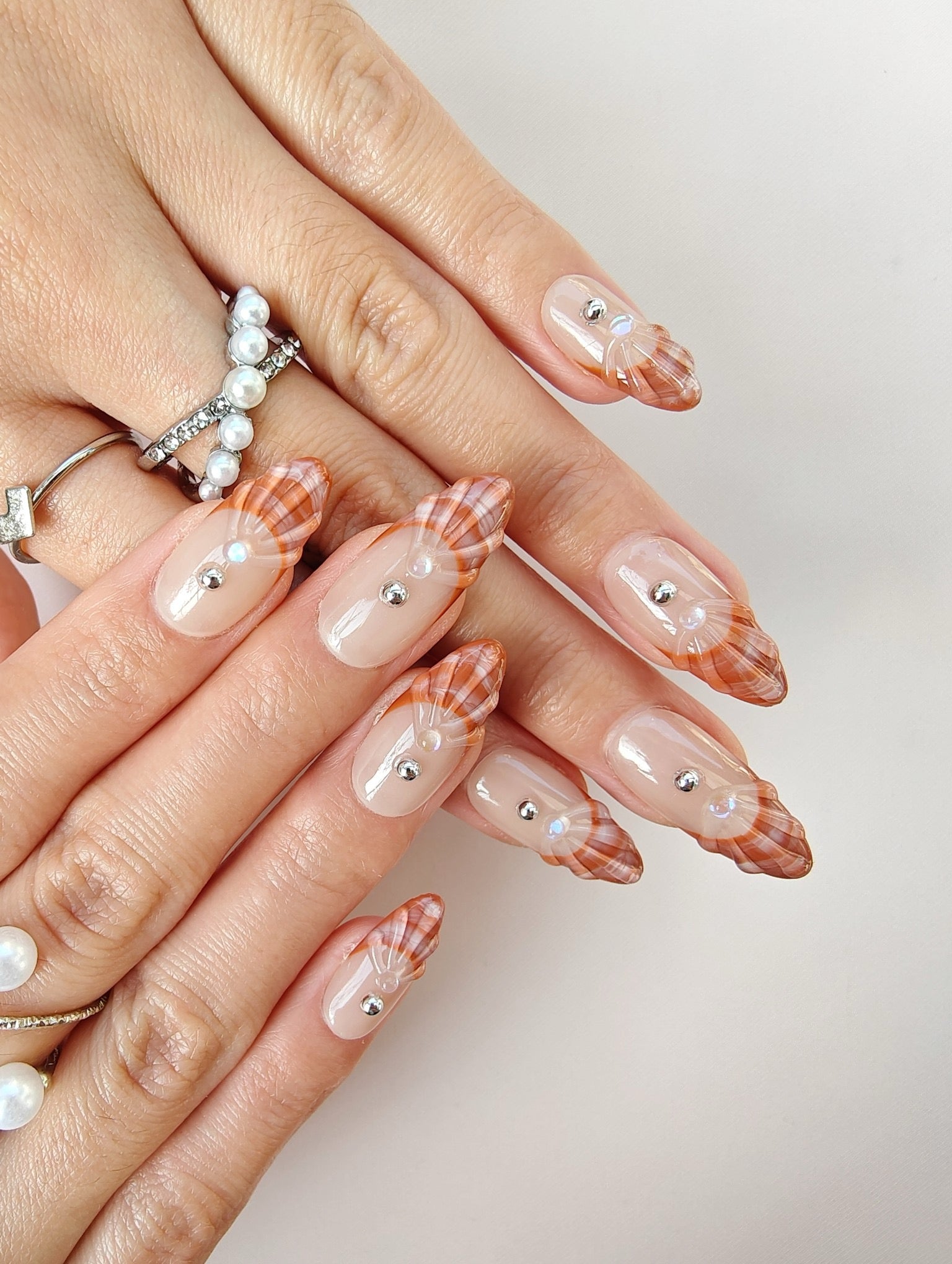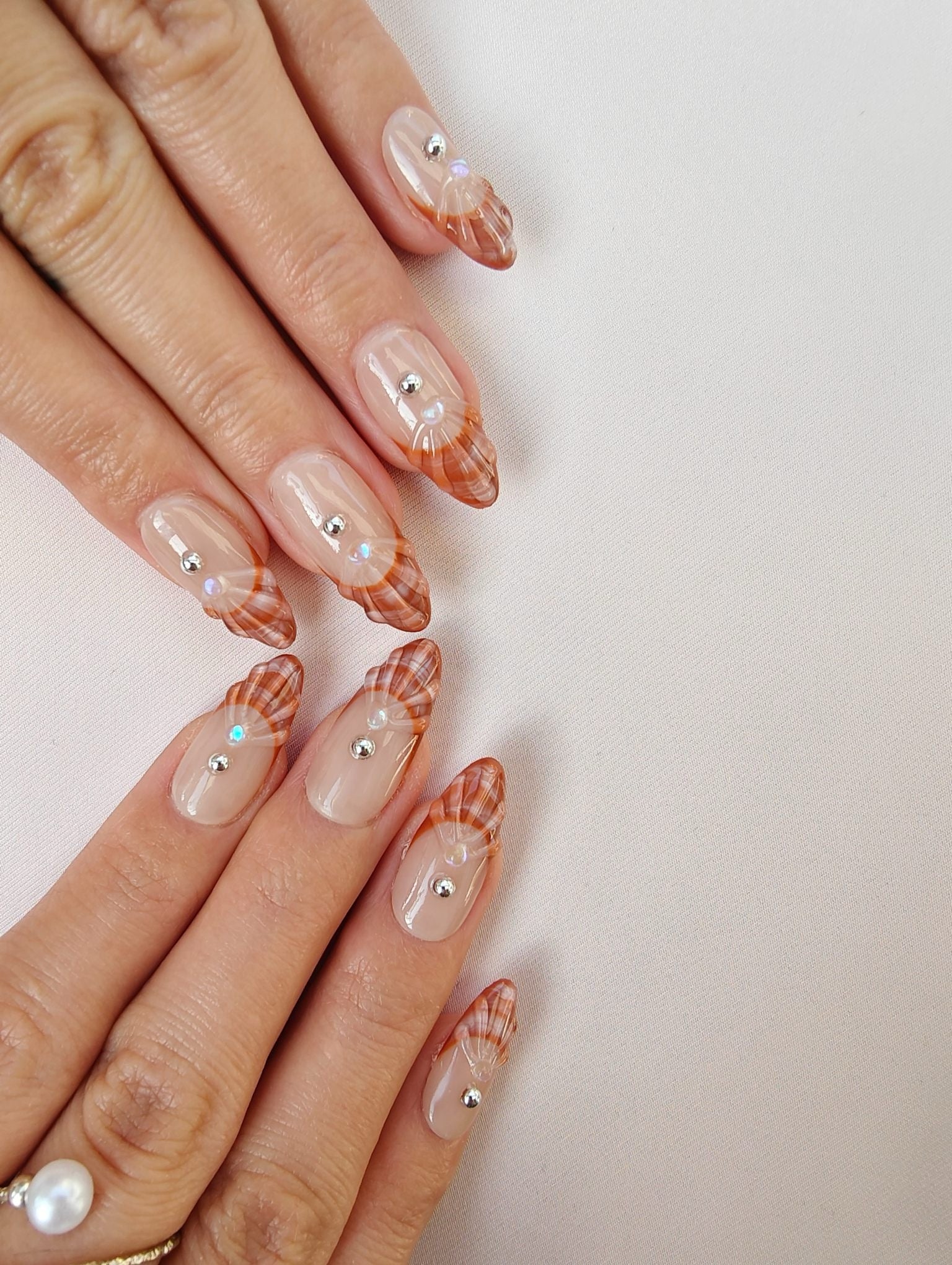 This nail set features a warm orange base with crystal accents, creating a unique shell-like texture. The crystal embellishments add elegance and sophistication, making it perfect for those who seek individuality and style. Whether for everyday wear or a day out, this nail set will make your hands the center of attention.