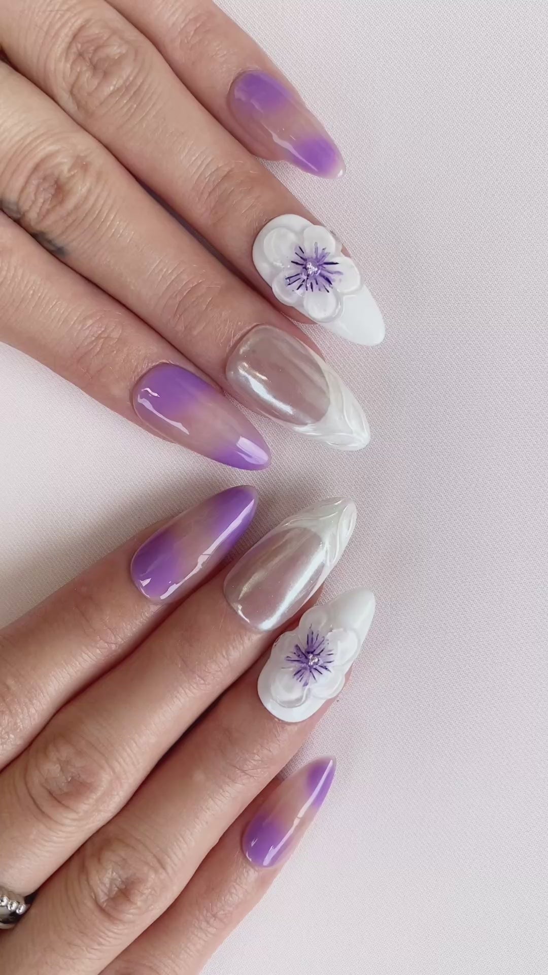 The Violet Dream nail design combines elegant purple gradients with pure white flowers, showcasing a romantic and dreamy effect. The delicate handcrafted floral design makes this nail set a perfect choice for any occasion, especially for highlighting your unique fashion sense during the spring and summer seasons.